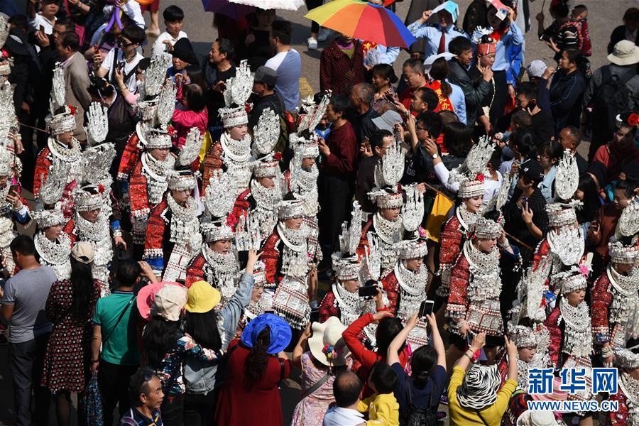 4月18日,臺江縣苗族群眾參加盛裝游演活動。 當日,貴州省黔東南苗族侗族自治州臺江縣迎來一年一度的苗族姊妹節(jié)。節(jié)日期間將舉行苗族盛裝游演、千人長桌宴、千人游方體驗、苗族手工創(chuàng)意大賽等一系列活動。 姊妹節(jié)是臺江縣苗族同胞的傳統(tǒng)節(jié)日,2006年被列入第一批國家級非物質文化遺產(chǎn)名錄。 新華社記者 楊文斌 攝