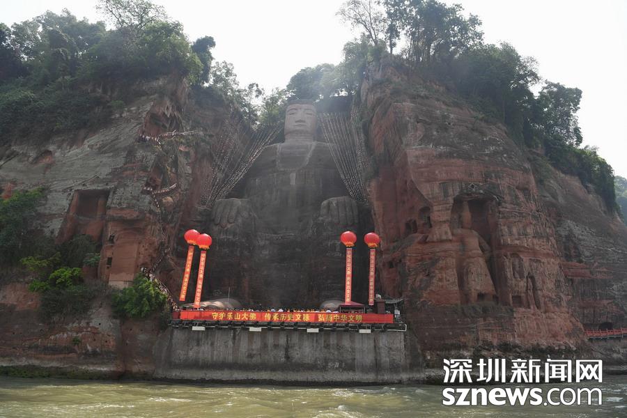 2019年4月26日,四川樂(lè)山,樂(lè)山大佛經(jīng)過(guò)閉關(guān)“體檢”、美容保養(yǎng)及智能監(jiān)測(cè)等環(huán)節(jié)后,胸腹部開裂險(xiǎn)情排除,生物病害得到有效控制,大佛正式出關(guān)。