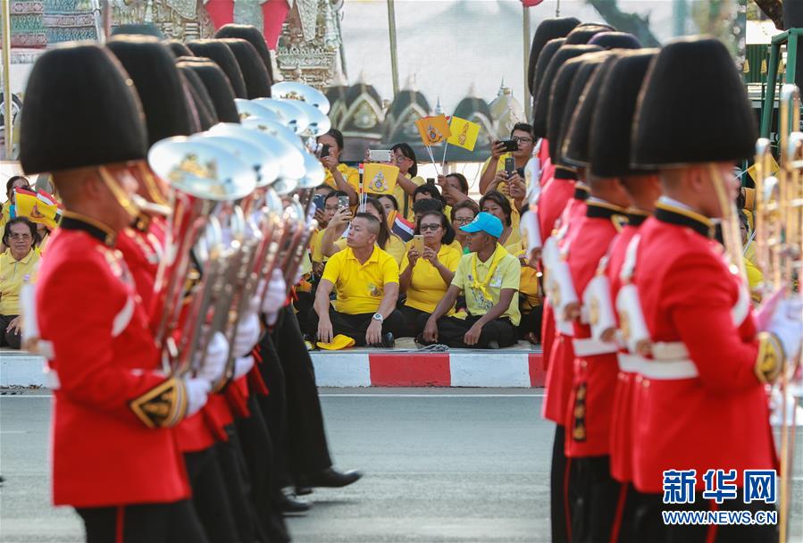5月5日,儀仗隊(duì)在曼谷大王宮附近舉行的泰國國王加冕典禮巡游上列隊(duì)前進(jìn)。 新華社記者 張可任 攝