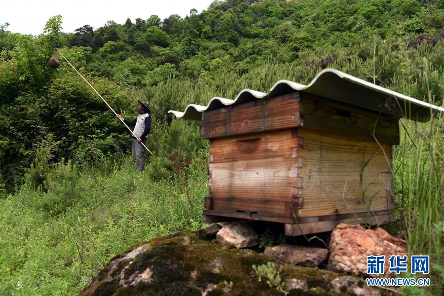 5月10日,在甘肅省隴南市徽縣大河店鎮(zhèn)硬灣村,蜂農(nóng)周仲頤在收蜂。 甘肅省隴南市徽縣大河店鎮(zhèn)硬灣村位于秦巴山區(qū)深處,2017年,在當(dāng)?shù)卣姆龀窒拢堁吕铣裁垧B(yǎng)殖農(nóng)民專業(yè)合作社成立,蜂農(nóng)們將傳統(tǒng)養(yǎng)蜂技藝和現(xiàn)代加工方式相結(jié)合,并通過電商等渠道打開銷路,有效帶動(dòng)了當(dāng)?shù)刎毨Т迕衩撠氈赂弧D壳罢麄€(gè)合作社共有蜂箱2000余個(gè),每箱每年可帶來三四千元的收入。 新華社記者 馬寧 攝