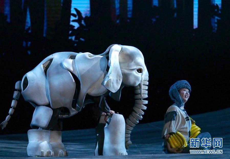 5月15日在上海美琪大戲院拍攝的新版大型人偶舞臺劇《最后一頭戰(zhàn)象》劇照。 當日,作為第12屆中國藝術(shù)節(jié)的參演劇目,大型人偶舞臺劇《最后一頭戰(zhàn)象》在經(jīng)過4次硬件技術(shù)升級和故事修改后亮相上海美琪大戲院。 新華社記者 任瓏 攝