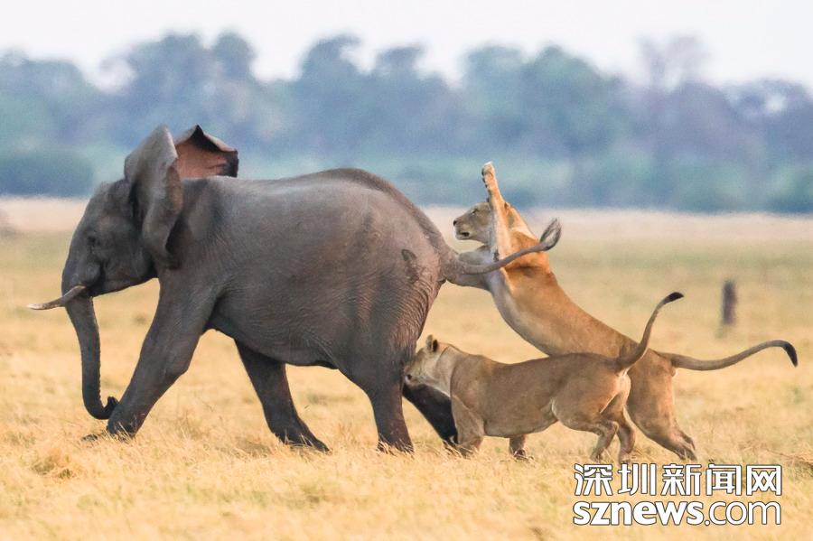英國攝影師詹姆斯(James Gifford)在博茨瓦納喬貝國家公園拍到一群獅子獵食大象的精彩畫面。在詹姆斯的鏡頭下,一頭母獅跳到了一頭小象的背上想要將其拿下,但僅憑一己之力又不能做到。但當(dāng)母獅的后援抵達時,象群也趕到了現(xiàn)場。最終,小象回到了象群中獲得庇護,而獅群也不得不悻悻離去。