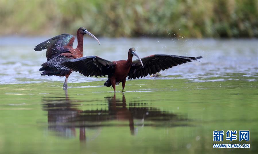 這是在漢江濕地公園嬉水的2只彩鹮(5月4日攝)。 近日,國(guó)家二級(jí)保護(hù)動(dòng)物彩鹮現(xiàn)身陜西省漢中市漢江濕地公園濂水河與漢江交匯處。 據(jù)陜西師范大學(xué)生命科學(xué)院教授于曉平介紹,彩鹮在世界上的分布比朱鹮還要少,這幾年在云南發(fā)現(xiàn)得多一些,這3只彩鹮現(xiàn)身漢江濂水河畔,是陜西首次發(fā)現(xiàn)彩鹮蹤跡。 據(jù)了解,彩鹮是國(guó)家二級(jí)保護(hù)動(dòng)物,屬鵜形目鹮科,體羽大部為青銅栗色,是珍稀鳥類朱鹮的“近親”,體型比朱鹮略小。 新華社發(fā)