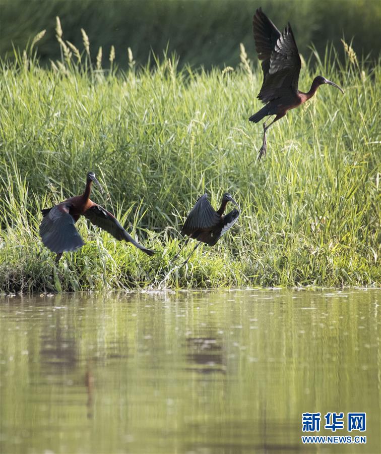 這是在漢江濕地公園飛翔的3只彩鹮(4月29日攝)。 近日,國(guó)家二級(jí)保護(hù)動(dòng)物彩鹮現(xiàn)身陜西省漢中市漢江濕地公園濂水河與漢江交匯處。 據(jù)陜西師范大學(xué)生命科學(xué)院教授于曉平介紹,彩鹮在世界上的分布比朱鹮還要少,這幾年在云南發(fā)現(xiàn)得多一些,這3只彩鹮現(xiàn)身漢江濂水河畔,是陜西首次發(fā)現(xiàn)彩鹮蹤跡。 據(jù)了解,彩鹮是國(guó)家二級(jí)保護(hù)動(dòng)物,屬鵜形目鹮科,體羽大部為青銅栗色,是珍稀鳥類朱鹮的“近親”,體型比朱鹮略小。 新華社發(fā)(陶本耀 攝)