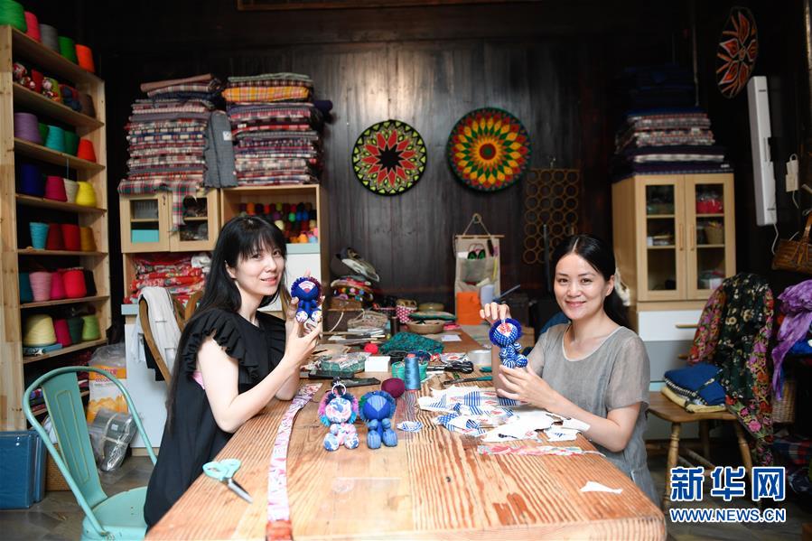 5月26日,在石舍村共同經(jīng)營“三只蝸?!笔止に嚻飞痰旰涂蜅5慕忝藐愖袭嫞ㄓ遥?、陳莫寒在展示制作的手工藝品。 石舍村是浙江省桐廬縣富春江鄉(xiāng)村慢生活體驗區(qū)中的三個村落之一,位置偏僻,依溪而居,風景秀美。近年來,石舍村結合古建筑保護工作,在清潔、美化村莊的基礎上,對一些廢棄古建筑進行修繕,引入咖啡館、民宿等文化創(chuàng)意類項目,優(yōu)良的生態(tài)環(huán)境和濃郁的文化氛圍吸引大批游客前來體驗,小山村走上了一條發(fā)展美麗經(jīng)濟之路。2018年,石舍村接待游客10萬8千余人次,旅游經(jīng)營凈收入1260余萬元。 新華社記者 黃宗治 攝