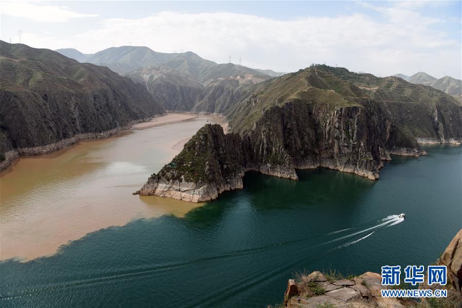 6月2日,在甘肅省臨夏回族自治州永靖縣劉家峽水庫(kù),一艘快艇在洮河和黃河的匯合水域行駛。