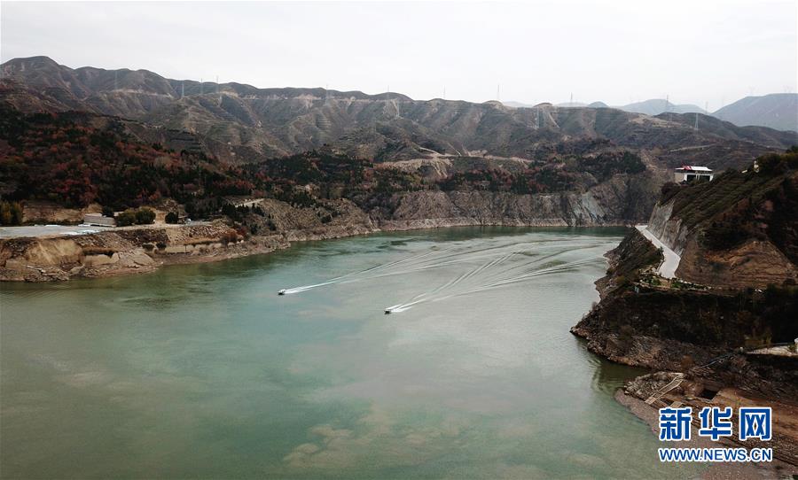 10月24日,兩艘快艇從劉家峽水庫(kù)庫(kù)區(qū)駛過(guò)(無(wú)人機(jī)拍攝)。 新華社記者 陳斌 攝