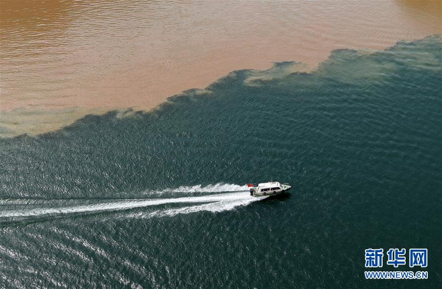 10月24日,一艘快艇從劉家峽水庫(kù)庫(kù)區(qū)的洮河與黃河交匯處駛過(guò)(無(wú)人機(jī)拍攝)。 新華社記者 陳斌 攝