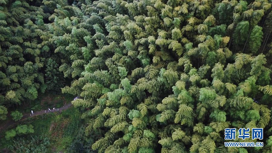 8月3日,游客行走在木坑竹海景區(qū)的小路上(無人機拍攝)。夏日,安徽省黃山市黟縣的木坑竹海景區(qū)風(fēng)景優(yōu)美,吸引不少游客前來休閑避暑。新華社記者張端攝