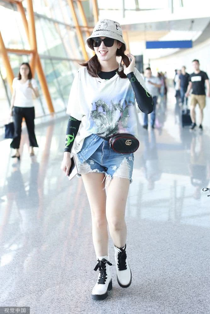 內(nèi)地女星彭小苒現(xiàn)身機(jī)場,穿印花T恤牛仔短褲,白色馬丁靴很時髦