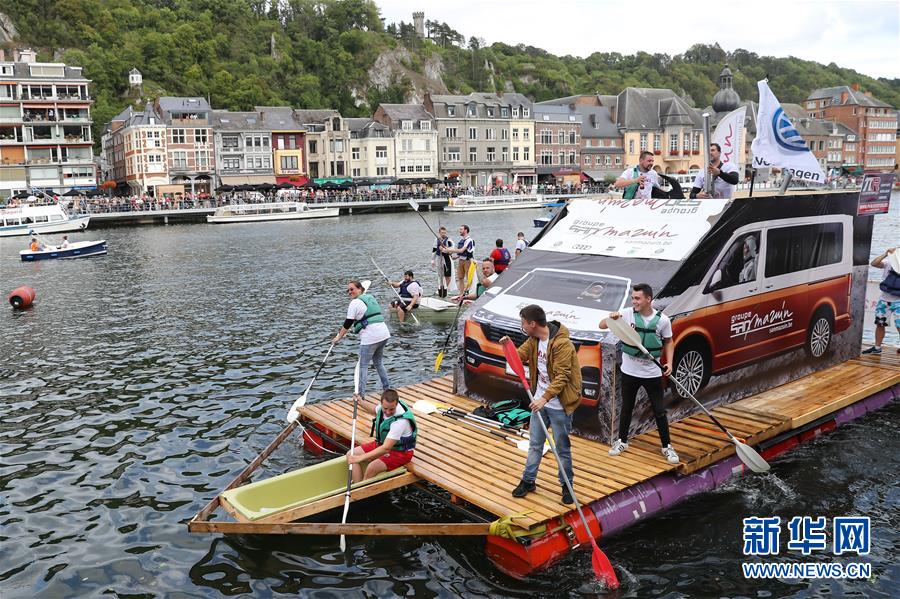 8月15日,在比利時南部小城迪南的默茲河上,人們參加“浴缸劃船節(jié)”的表演。