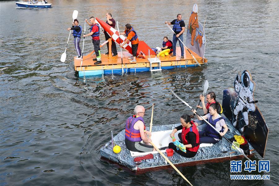 8月15日,在比利時南部小城迪南的默茲河上,人們參加“浴缸劃船節(jié)”的表演。 新華社記者 張鋮 攝