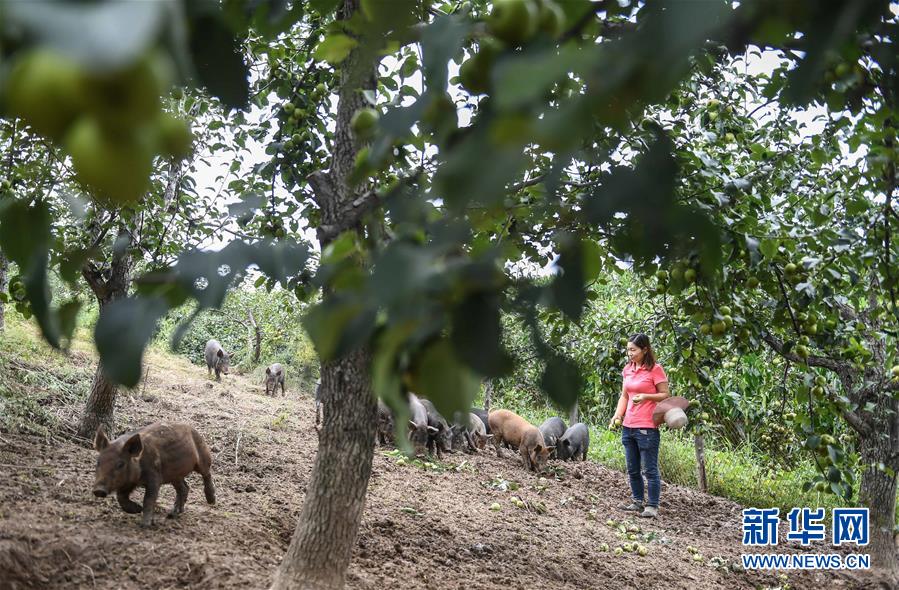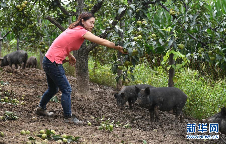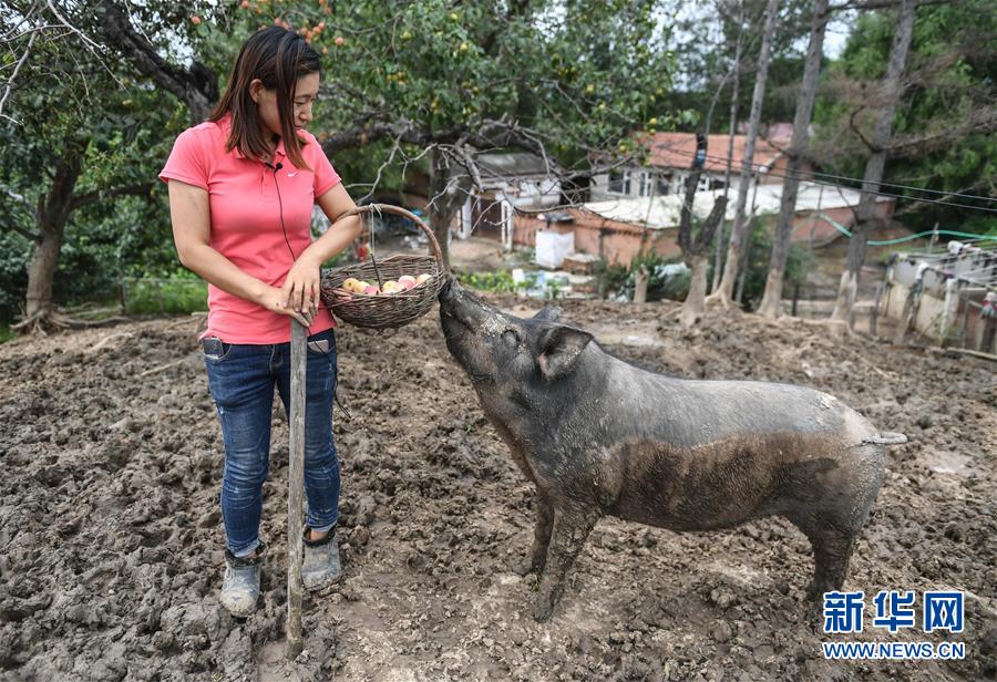 8月20日,康丹丹在果園內(nèi)喂豬吃蘋(píng)果梨。新華社記者 王昊飛 攝