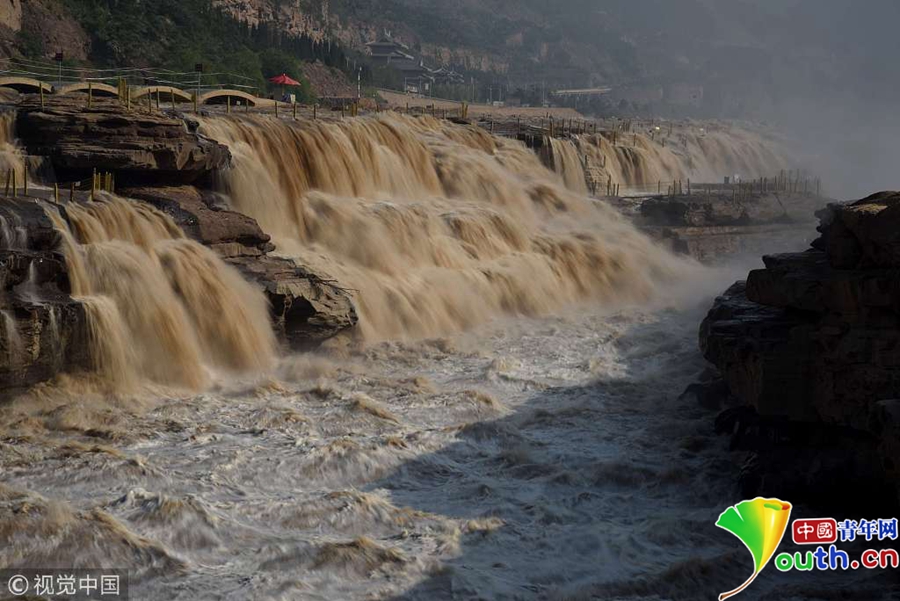 5月31日,山西臨汾奔騰咆哮的黃河壺口瀑布吸引游客。