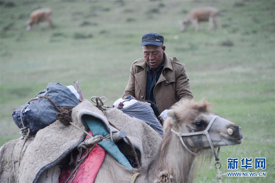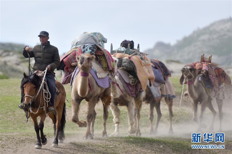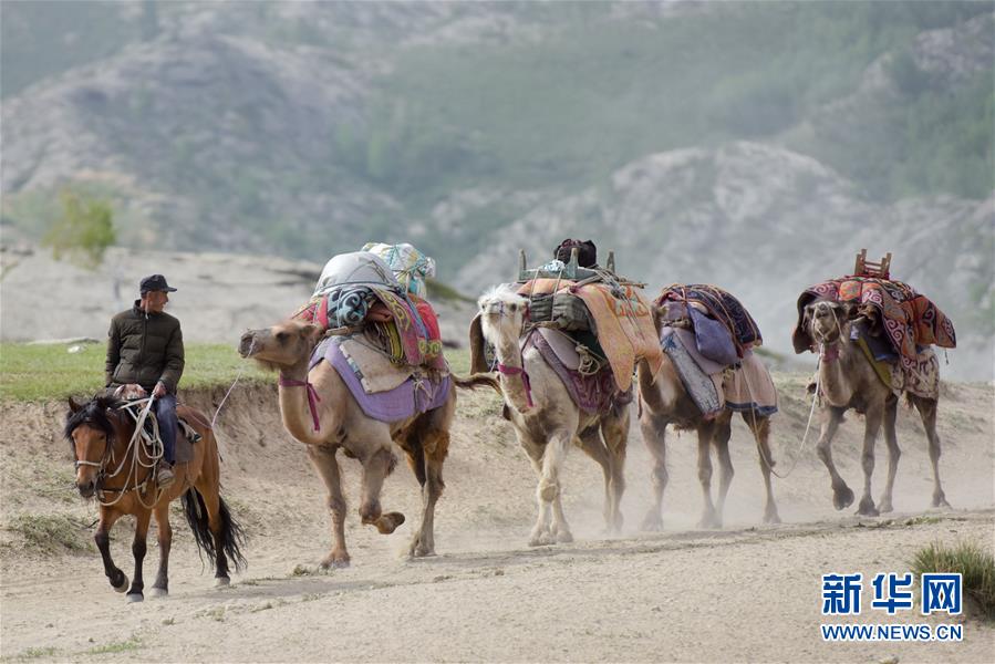6月6日,新疆阿勒泰地區(qū)福海縣牧民帶著駝隊行進在轉(zhuǎn)場途中。 新華社記者 丁磊 攝