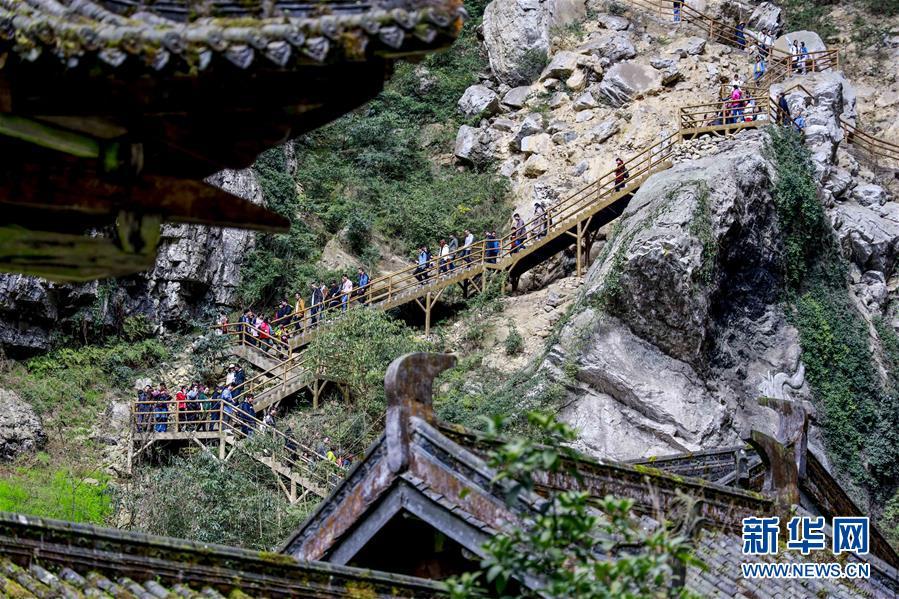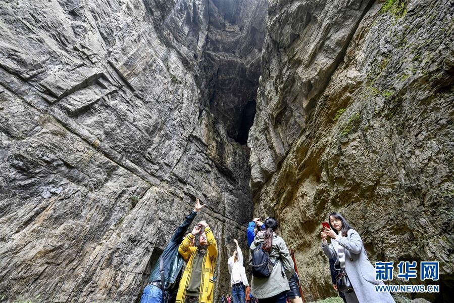 游客在天生三橋景區(qū)內(nèi)的天龍橋景點游覽(3月27日攝)。 新華社記者劉潺攝