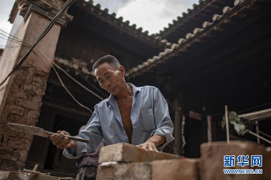 工人王建雄在修繕石屏縣異龍鎮(zhèn)符家營村189號民居的圍墻(8月8日攝)。新華社記者 江文耀 攝