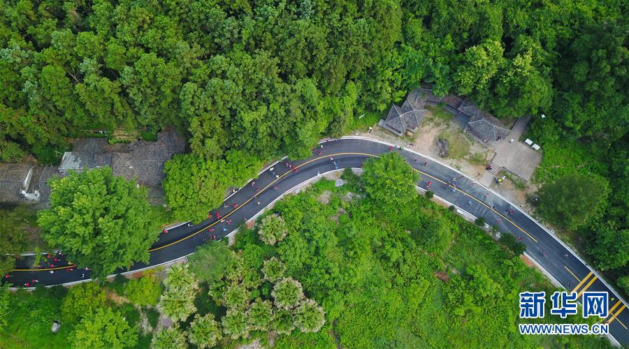 參加首屆丹霞山半程馬拉松的選手們在林間穿梭(2018年5月27日無人機(jī)拍攝)。 新華社記者 鄧華 攝