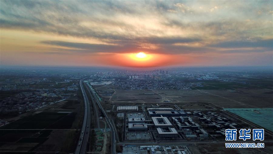 3月31日無(wú)人機(jī)拍攝的雄安新區(qū)市民服務(wù)中心(前)遠(yuǎn)處為容城縣城區(qū)。新華社記者牟宇攝