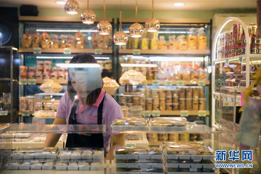 9月1日,店員在泰國曼谷著名的“九姐妹甜點(diǎn)”店整理貨架。