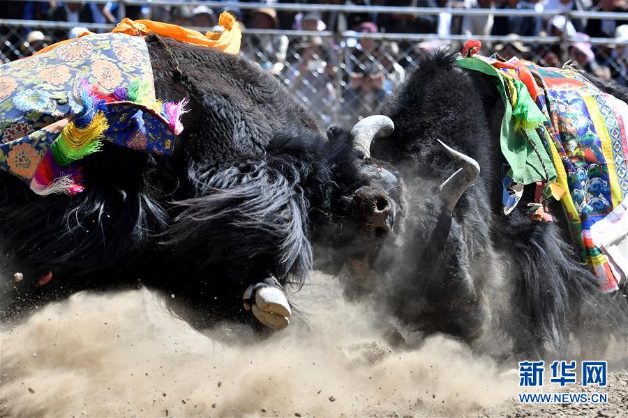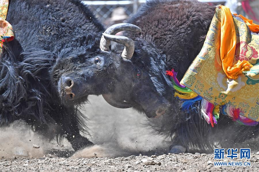 者下鄉(xiāng)斗牛節(jié)歷史悠久,是西藏自治區(qū)非物質(zhì)文化遺產(chǎn)。牧民為參加比賽的種牦牛披綢掛緞,將牛群趕到位于日喀則市白朗縣者下鄉(xiāng)的斗牛場上。參賽的種牦牛為了爭奪牛群的控制權(quán),在成群的母牛面前,更加好斗。角斗有的瞬間分出勝負(fù),有的持續(xù)幾十分鐘,最終勝出的被稱為“牦牛至尊”。