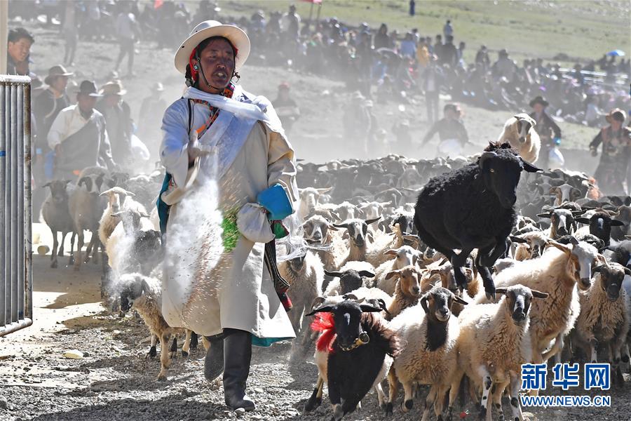 9月9日,羊群在進(jìn)入場地時牧民撒青稞祈福。李鑫 攝