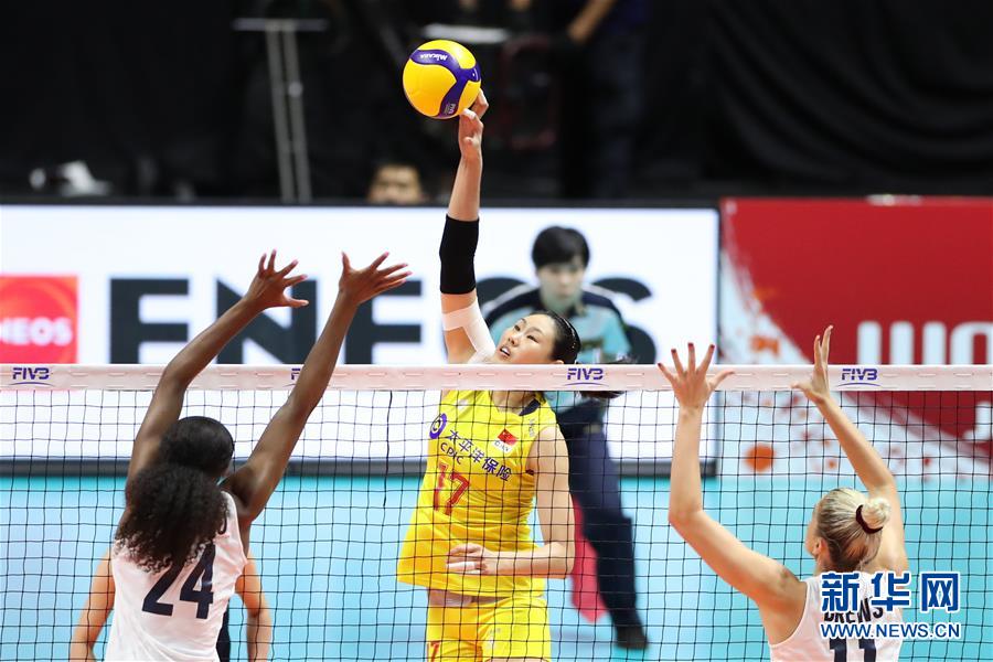 9月23日,中國隊球員顏妮(中)在比賽中扣球。當日,在日本札幌舉行的2019年女排世界杯賽第二階段A組循環(huán)賽中,中國隊以3比0戰(zhàn)勝美國隊。新華社記者杜瀟逸攝