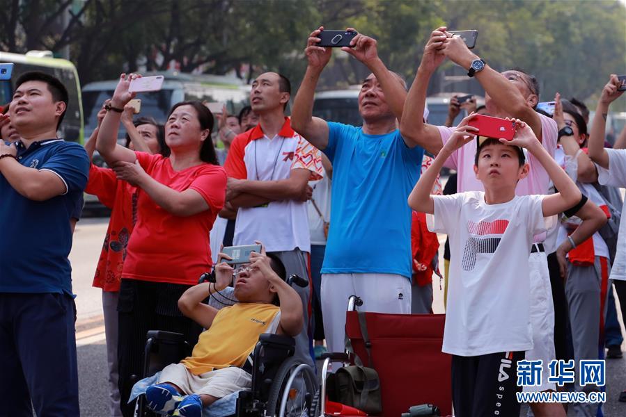 10月1日,市民在北京南新華街拍攝飛過北京上空的受閱飛機。當日是國慶節(jié),全國各地的人們用各種方式歡度節(jié)日。新華社記者 薛東梅 攝