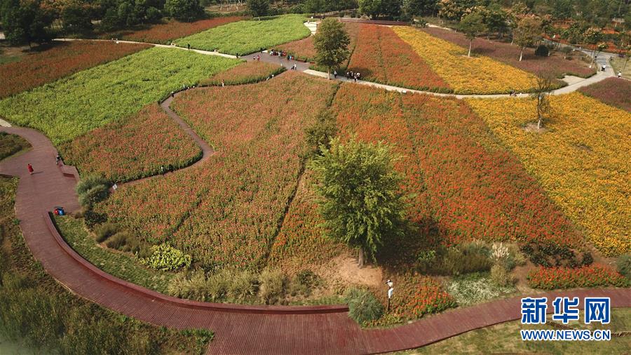 10月9日無(wú)人機(jī)拍攝的四季花海城市公園風(fēng)景。 秋日時(shí)節(jié),位于安徽省合肥市的四季花海城市公園花香四溢,色彩繽紛,成為游客和市民休閑游玩的好去處。 新華社記者 張端 攝