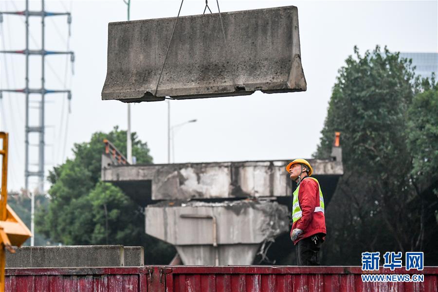 10月12日,錫港路恢復(fù)通車前,施工人員在進(jìn)行路面清理工作。新華社記者 李博 攝