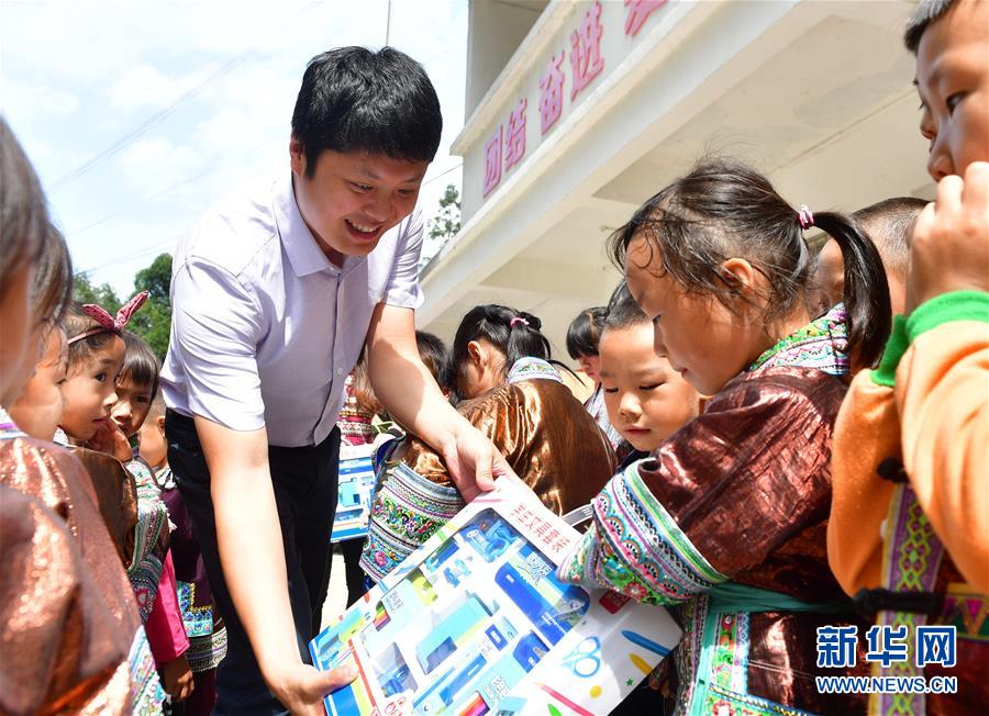 志愿者給黔桂烏英苗寨的孩子們發(fā)放文具(10月11日攝)。新華社記者 黃孝邦 攝