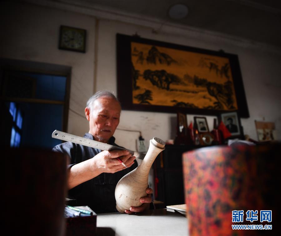 10月12日,丁國坤在家中對(duì)一件未成形的脫胎漆器進(jìn)行“彩繪”工序。新華社記者胡晨歡攝