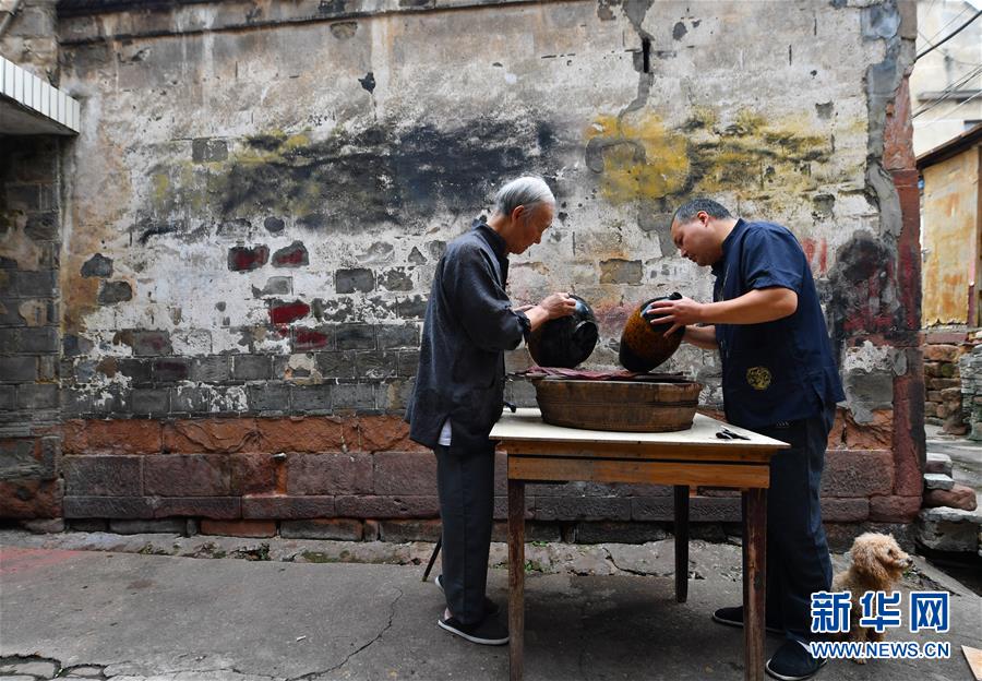 10月12日,丁國坤(左)和徒弟在家門口對(duì)未成形的脫胎漆器進(jìn)行“磨顯”工序。新華社記者胡晨歡攝