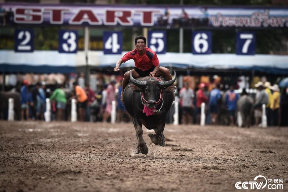 當(dāng)?shù)貢r(shí)間2019年10月12日,泰國春武里舉行一年一度的水牛賽跑,選手騎??癖?。視覺中國