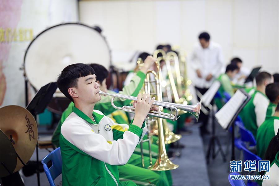 重慶市特殊教育中心排練廳,王太樊(左一)和同學(xué)老師們一起排練(10月9日攝)。 新華社記者 劉潺 攝