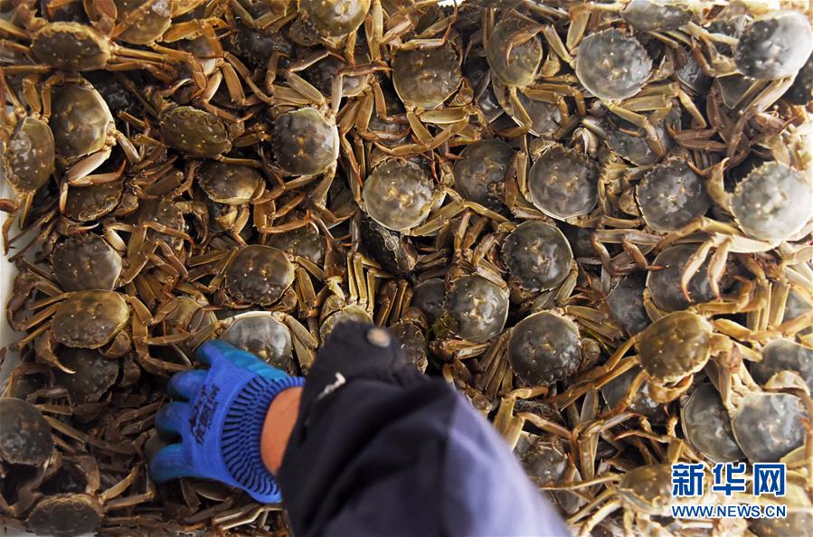 時下正值山東東營黃河口大閘蟹收獲的季節(jié),各養(yǎng)殖區(qū)的工人們正在緊張進行大閘蟹的收獲、包裝作業(yè),將產(chǎn)品銷售國內外市場。