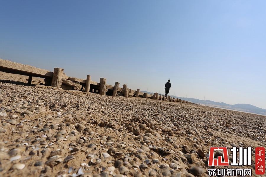 江西九江,隨著水位持續(xù)下降,豐水期浸泡在鄱陽湖底被譽為“中國最長的湖中古木石橋”露出水面。