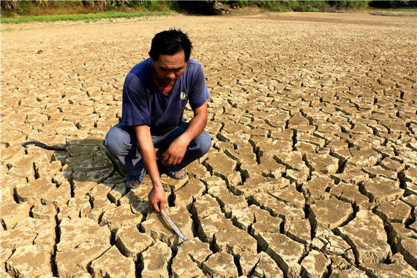 當(dāng)?shù)貢r間2016年5月13日,柬埔寨甘丹省,受厄爾尼諾現(xiàn)象影響,當(dāng)?shù)卦庥龈珊堤鞖猓靥粮珊蚤_裂。