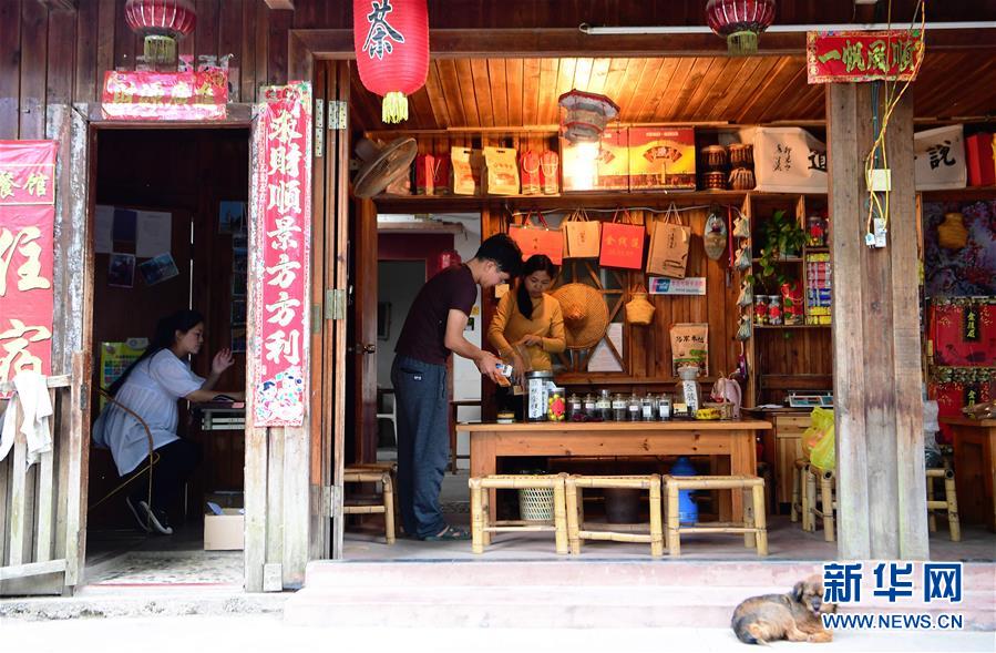 在龍巖市永定區(qū)湖坑鎮(zhèn)洪坑村土樓群游覽區(qū),土樓周邊的村民開設了農(nóng)產(chǎn)品特產(chǎn)店和飲食店來吸引游客消費(5月4日攝)。新華社記者魏培全攝