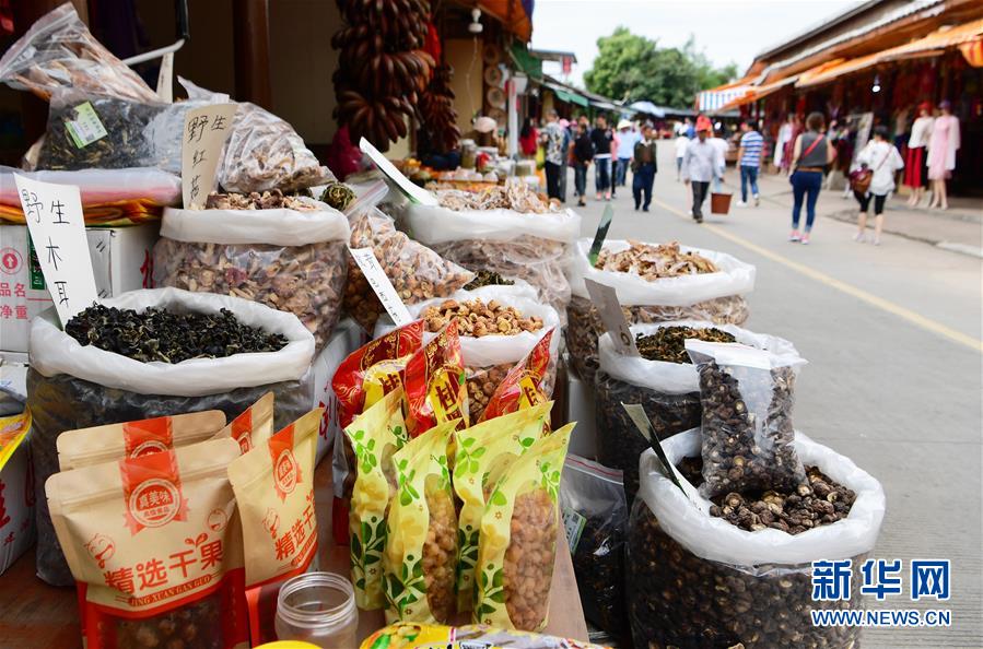 在龍巖市永定區(qū)湖坑鎮(zhèn)高頭鄉(xiāng)高北村的土樓風情一條街,當?shù)卮迕癜炎约荷a(chǎn)的各式農(nóng)產(chǎn)品向參觀游客進行銷售(5月4日攝)。新華社記者魏培全攝