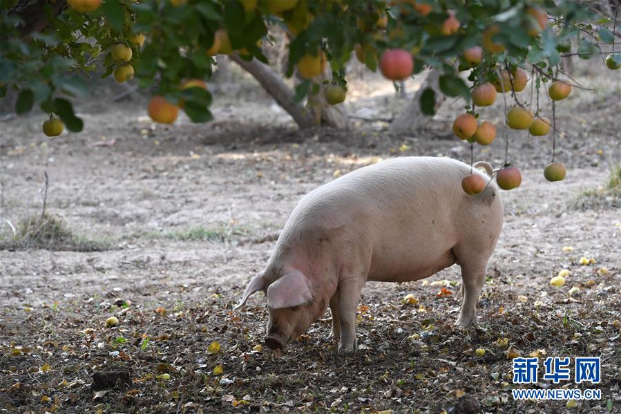 10月24日,在敦煌市郭家堡鎮(zhèn)一處果園,一頭豬在果樹下覓食。新華社記者 馬寧 攝