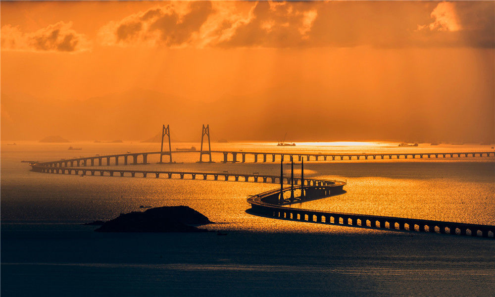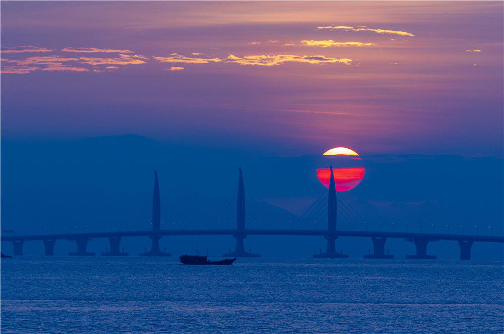 2018年10月22日早晨,從廣東珠海市的情侶路向東眺望,一輪紅日從東方冉冉升起,將港珠澳大橋映射得格外迷人?!俺?jí)工程”港珠澳大橋?qū)⒂?4日上午9時(shí)正式通車。張煒(香港分社)/中新社/視覺(jué)中國(guó)