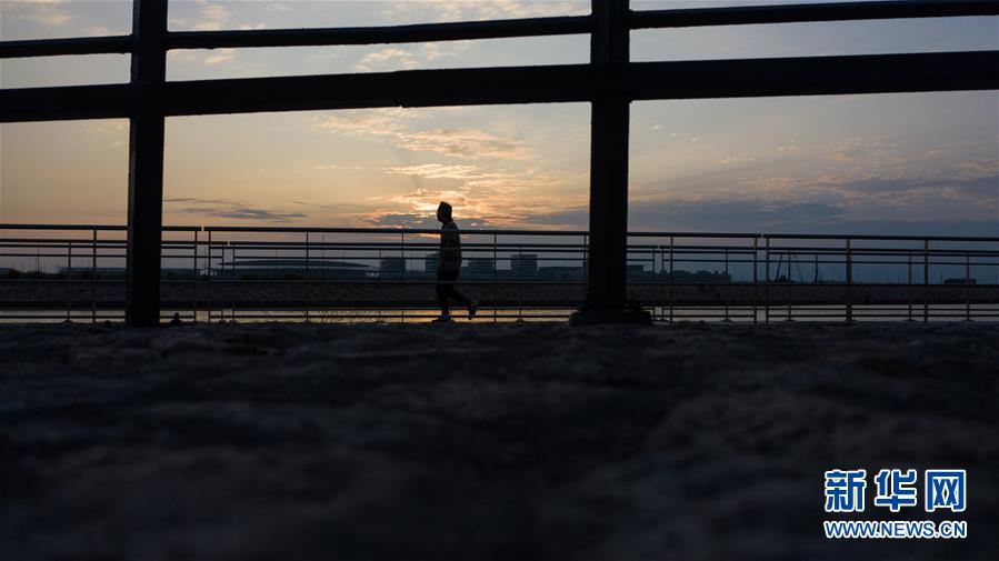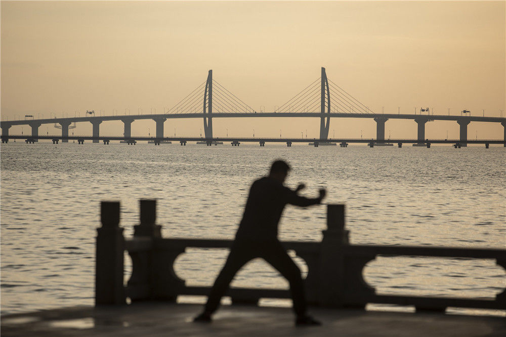 10月24日,晨起的澳門市民在海邊跑步。2018年10月23日,港珠澳大橋正式開(kāi)通。新華社記者張金加攝