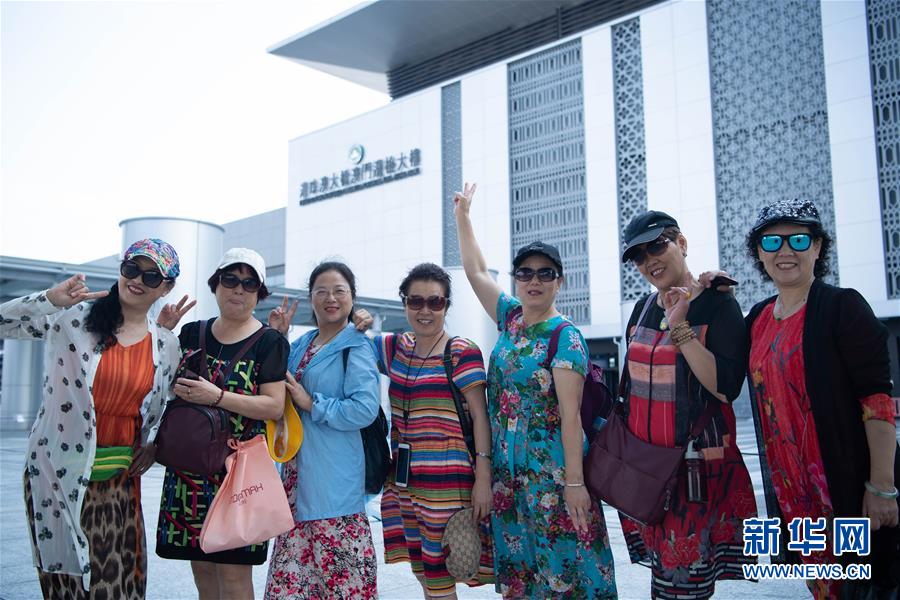 10月24日上午,旅客在港珠澳大橋澳門邊檢大樓附近合影。2018年10月23日,港珠澳大橋正式開(kāi)通。新華社記者張金加攝