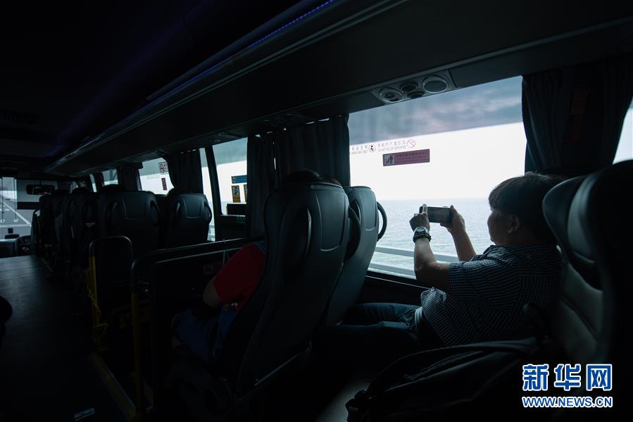 10月24日上午,一名乘客在往香港方向的港珠澳大橋穿梭巴士上拍照。2018年10月23日,港珠澳大橋正式開(kāi)通。新華社記者張金加攝