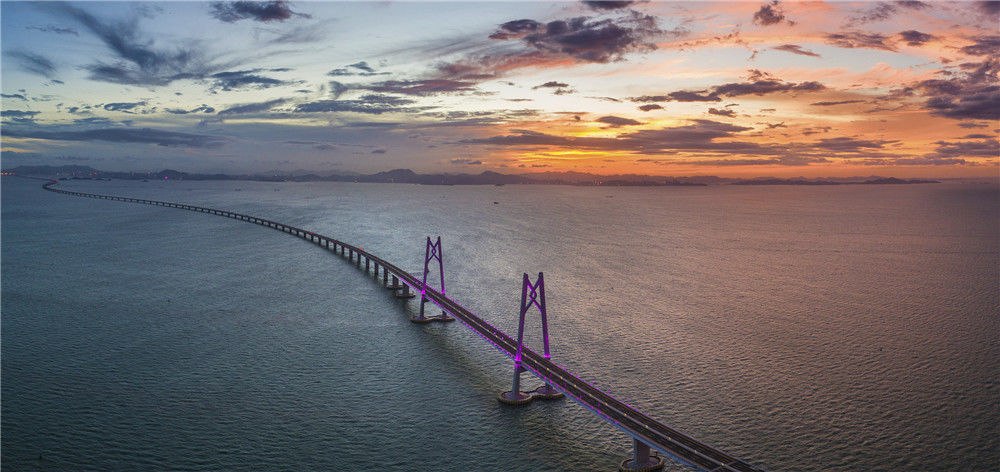2018年7月18日,廣東珠海,滿天紅霞,亮燈后的港珠澳大橋跨立在伶仃洋上,進(jìn)入通車前的最后準(zhǔn)備。張由瓊/視覺(jué)中國(guó)