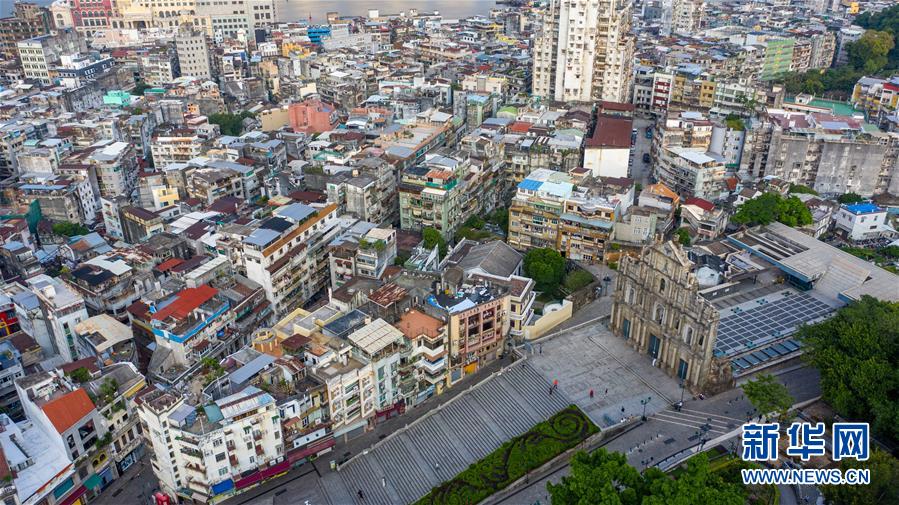 10月24日早晨無(wú)人機(jī)拍攝的澳門著名歷史遺跡——大三巴牌坊及周邊區(qū)域。2018年10月23日,港珠澳大橋正式開(kāi)通。新華社記者張金加攝