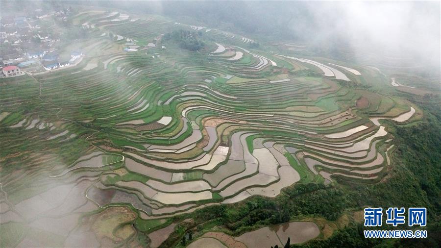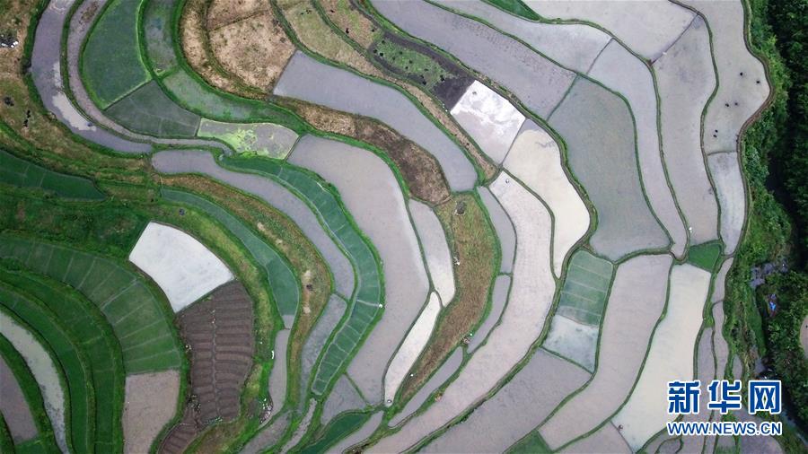 5月18日,農民在貴州省丹寨縣龍泉鎮(zhèn)高要梯田里耕作(無人機拍攝)。初夏時節(jié),位于貴州省丹寨縣龍泉鎮(zhèn)的高要梯田景色優(yōu)美。新華社記者楊文斌攝