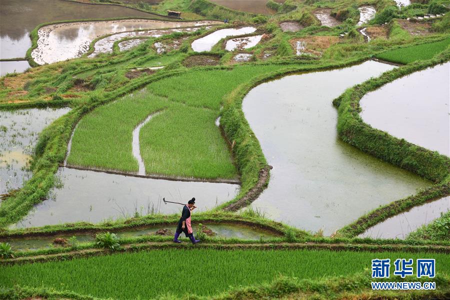 5月18日,農民從貴州省丹寨縣龍泉鎮(zhèn)高要梯田里走過。初夏時節(jié),位于貴州省丹寨縣龍泉鎮(zhèn)的高要梯田景色優(yōu)美。新華社記者楊文斌攝