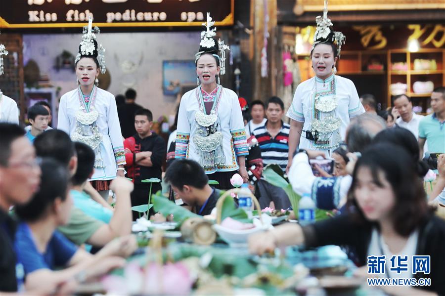 當日,貴州省黔東南苗族侗族自治州丹寨縣迎來苗族傳統節(jié)日“吃新節(jié)”,游客與苗族同胞在萬達小鎮(zhèn)參加“萬人長桌宴”,歡度節(jié)日,慶祝豐收。
